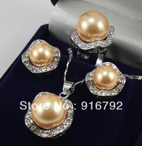 HOT Sale Prett Lovely Women's Wedding 18KGP yellow shell pearl10mm earring14mm ring pendant -silver-jewelry