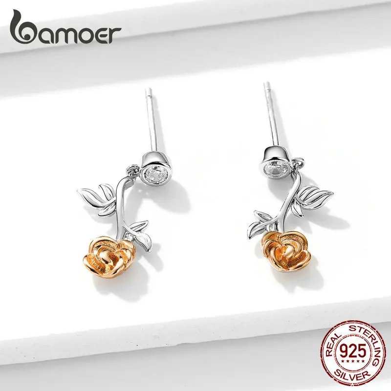 3D Rose Flower Branch Female Dangle Earrings for Women Authentic 925 Sterling Silver Luxury Jewelry